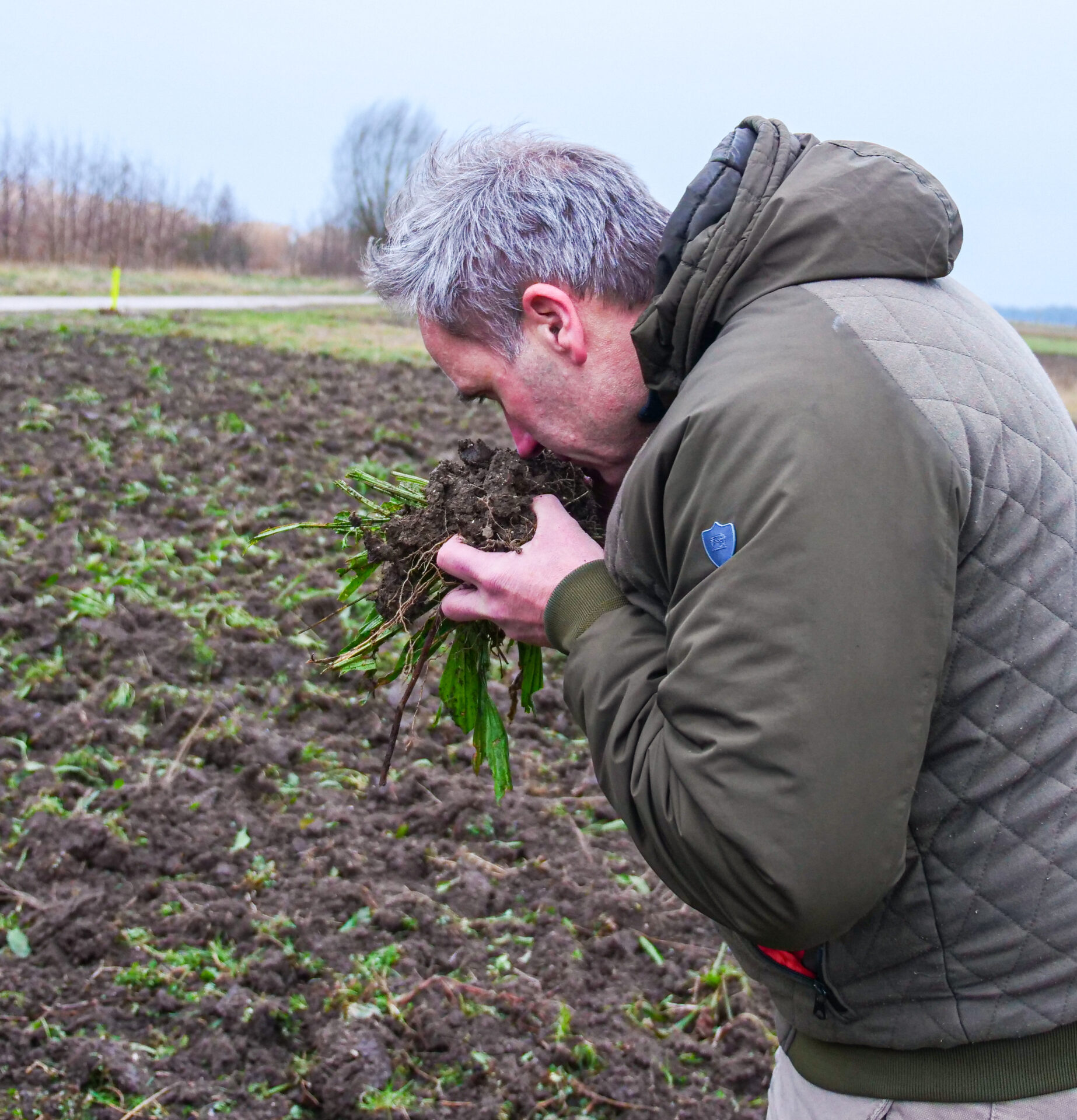 Biologisch akkerbouwer Joost van Strien teelt sinds 2020 niet alleen zonder kunstmest, maar ook geheel zonder dierlijke mest (vandaar de naam ‘No Shit Food’). Ter vervanging teelt hij nu apart stikstofbindende gewassen zoals luzerne die hij 3 of 4 keer per jaar verhakseld en als zogenoemde ‘maaimeststoffen’ toevoegt aan snelgroeiende teelten zoals spinazie, kool en aardappelen. Tijdens de rondleiding vertelde Joost hoe hij al jaren gericht bezig is met schaalverkleining en diversificatie van zijn akkerbouwbedrijf met investeringen in onder meer een voedselbos en rijen met bomen en struiken tussen de één- en meerjarige strokenteelten en mengteelten.