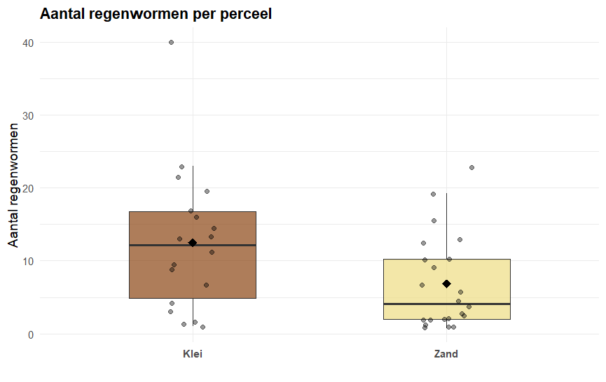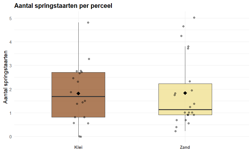 Het is noodzakelijk om te benadrukken dat een hoog organisch stofgehalte niet voor elke boer vanzelfsprekend of haalbaar is. Dit hangt namelijk sterk samen met factoren die grotendeels buiten de invloed van de boer liggen, zoals grondsoort en ligging. Zo bevatten kleigronden van nature vaak meer organische stof dan zandgronden, waar organisch materiaal juist sneller wordt afgebroken. Dit is ook terug te zien in figuur 2 en 3, waar de grondsoorten (klei en zand) met elkaar vergeleken worden ten opzichte van het gemiddeld aantal regenwormen en springstaarten. Hier zie je ook dat er gemiddeld meer regenwormen en springstaarten op kleigrond te vinden zijn ten opzichte van zandgrond (klei is een grondsoort waar over het algemeen een hoog organisch stofgehalte te vinden is). Ook spelen historisch landgebruik en natuurlijke omstandigheden een rol in hoeveel organische stof een bodem kan opbouwen en vasthouden.